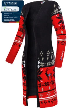Der Damen-Norweger-Cardigan NOORS vereint gemütliche Wärme mit modernem Chic – super für leicht kältere Tage und vielseitige Outfits. Aus atmungsaktivem, feinem Strick gefertigt, bietet dieser Mantel ein angenehm weiches Tragegefühl bei optimalem Komfort. Das stilvolle Norweger-Muster mit Hirschenmotiv in Weiß, Schwarz, Navy und Rot verleiht dem Cardigan seinen unverwechselbaren Winter-Look. Mit offenem Schnitt und langen Ärmeln ist NOORS perfekt als leichte Strickjacke für den Alltag, als eleganter Begleiter im Büro oder für entspannte Freizeitmomente. Elastische Ärmelbündchen sorgen für sicheren Halt, während detailreiche Logo-Stickereien die hochwertige Verarbeitung unterstreichen. Der Cardigan ist pflegeleicht bei 30 °C waschbar, bügelleicht und nicht trocknergeeignet. Ob beim Shopping, im Büro oder bei gemütlichen Treffen – NOORS Jacke passt drinnen wie draußen zu jedem Style und macht jeden Auftritt besonders. Im Zweifel lieber eine Nummer größer wählen.
